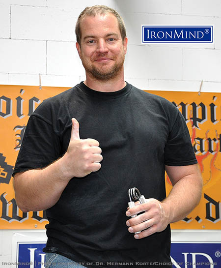 Mertz (who is 38 years old, stands 182 cm tall and weighs 105 kg), was impressive on his official attempt: His referee, Dr. Hermann Korte told IronMind, “Following the rules he closed the CoC No. 3 Gripper first on the right hand and right after with his left hand. It did not take him long and he did it in a way that seemed to be easy.”