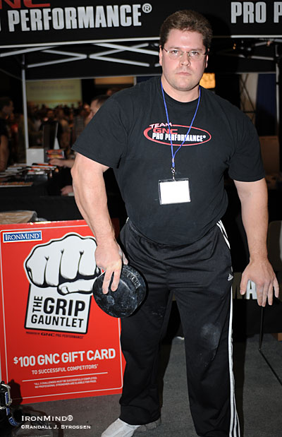 "Donovan Donnell, Ronnie Castro, James Rude, and Vache Sevajian became the latest to join the exclusive GNC Grip Gauntlet list by closing the No. 2 Captains of Crush® Gripper, lifting 187 pounds on the IronMind® Rolling Thunder®, and lifting the 50-pound Blob. In addition, Corey St. Clair, although ineligible [for the prize] due to his professional strongman status, was able to complete the challenges, while Dave Ostlund and Odd Haugen opted to save their grip for the strongman contest and 'only' chose to lift the 50-pound Blob.